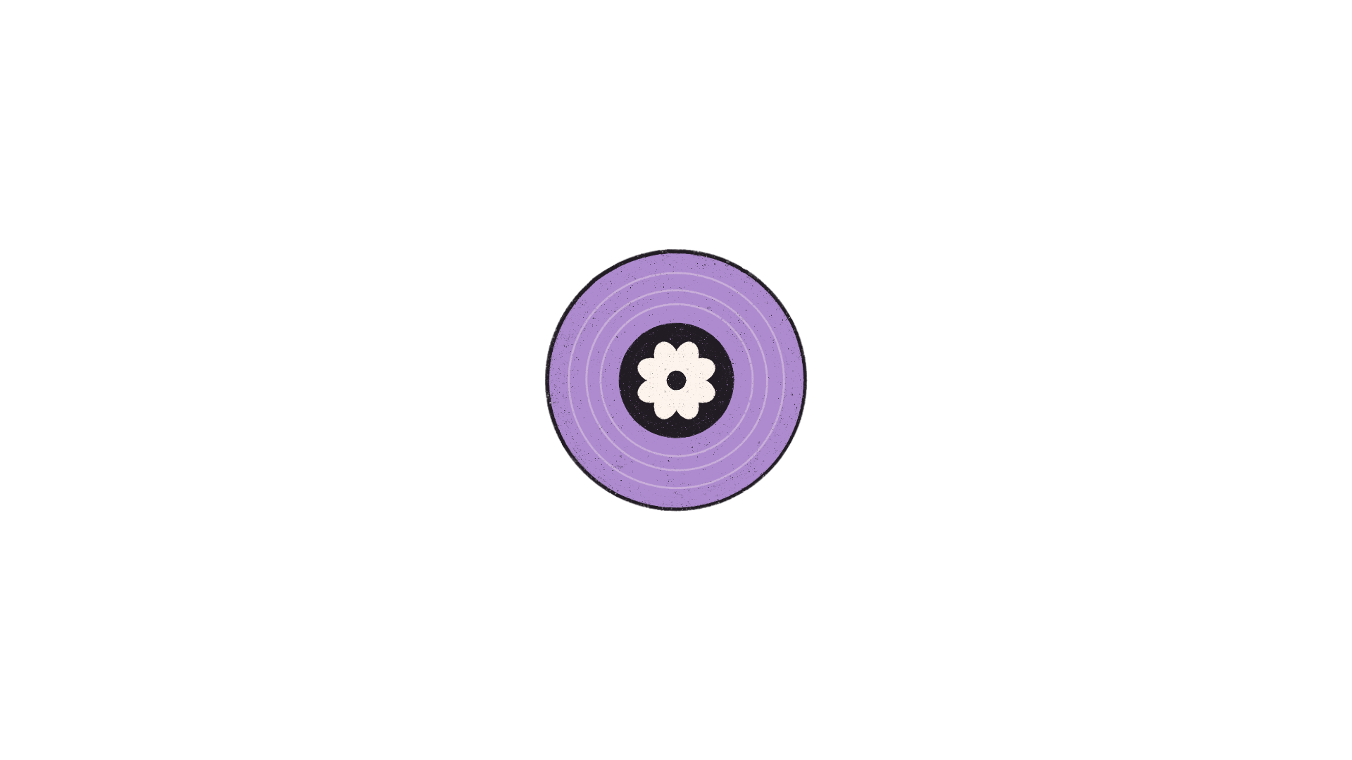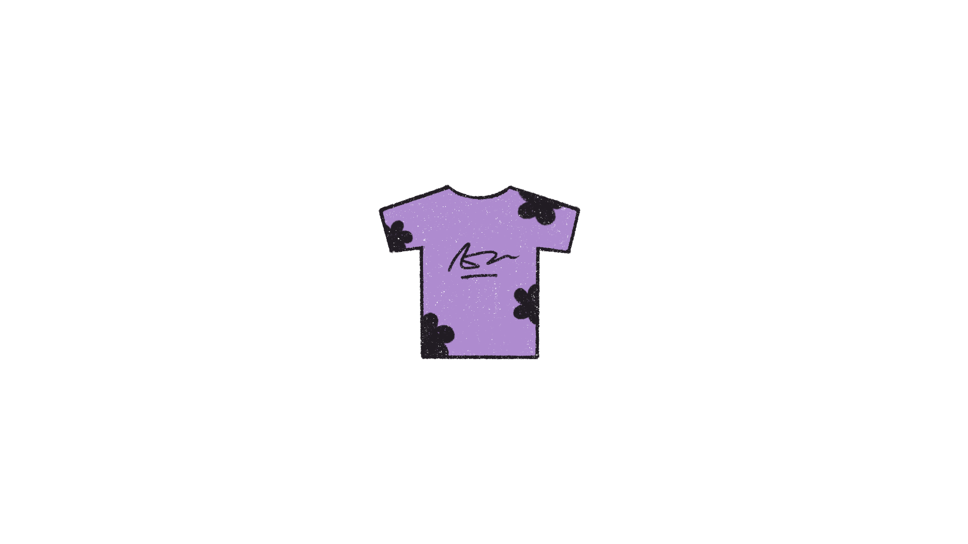 A purple t-shirt with black floral patterns and a signature representing branding on merchandise in the center.