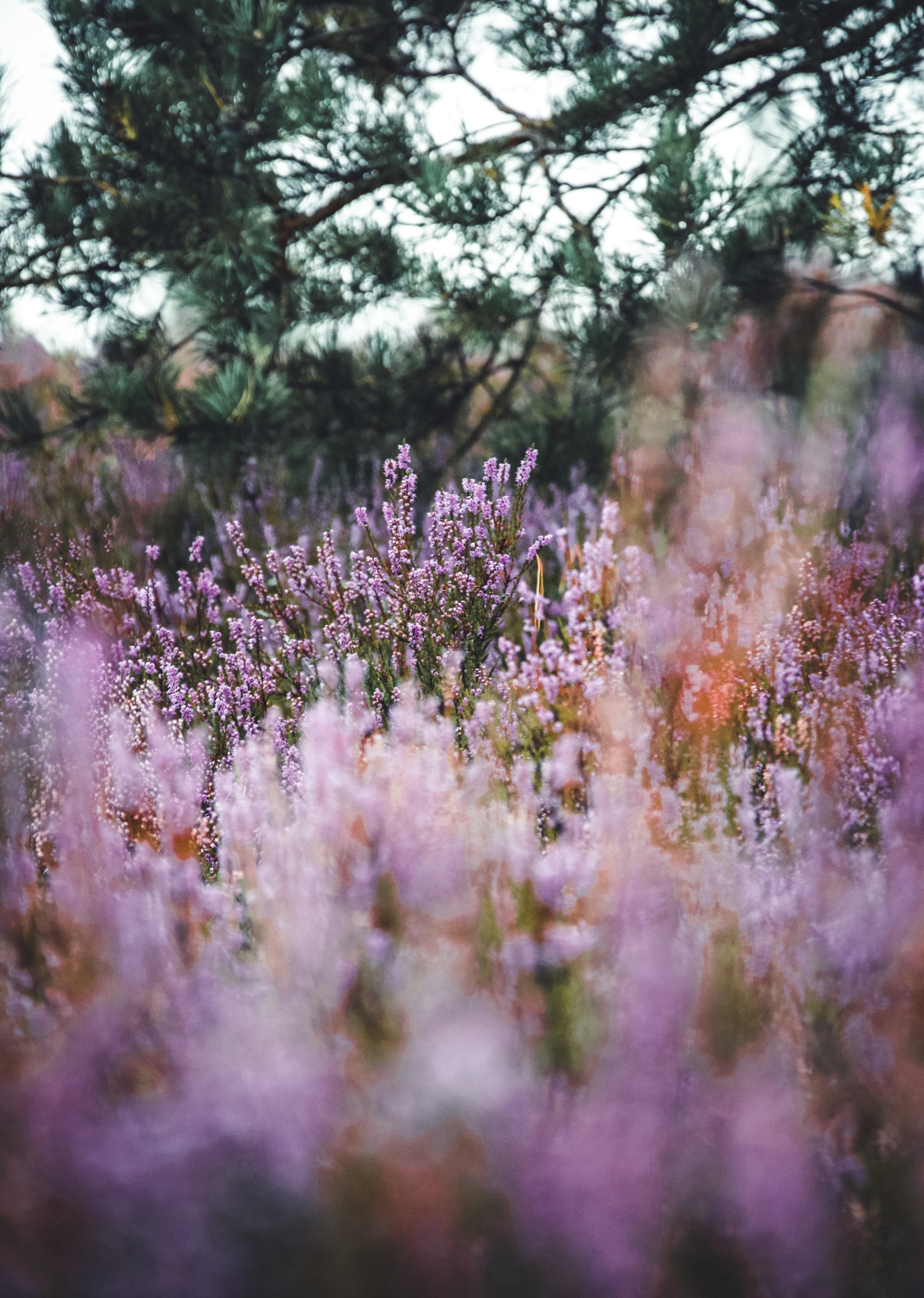 Close-up of blooming purple and pink flowers in a natural setting with tree branches and leaves in the background.